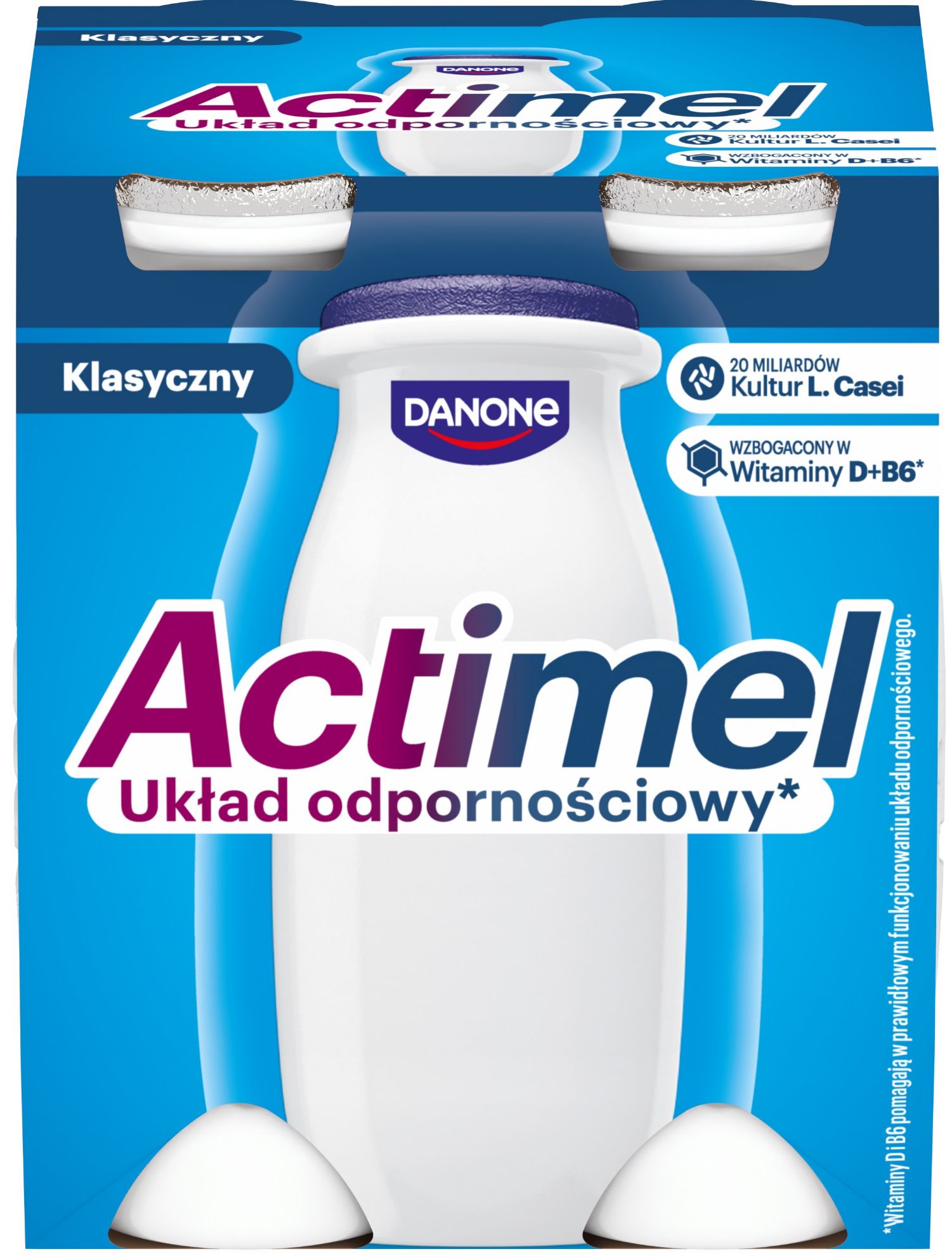 ACTIMEL naturālais jogurta dzēriens ar L. casei Danone un B6 un D vitamīniem. Neto masa 4x100g.