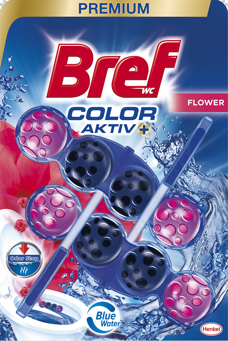 BREF Color Aktiv+ ar +50% spīdumu* un nepatīkamā aromāta neitralizēšanas tehnoloģiju. Tīrība starp skalošanas reizēm pateicoties zilā ūdens spēkam. Novērš kaļķakmens veidošanos. Svaigums. Higiēniskums.