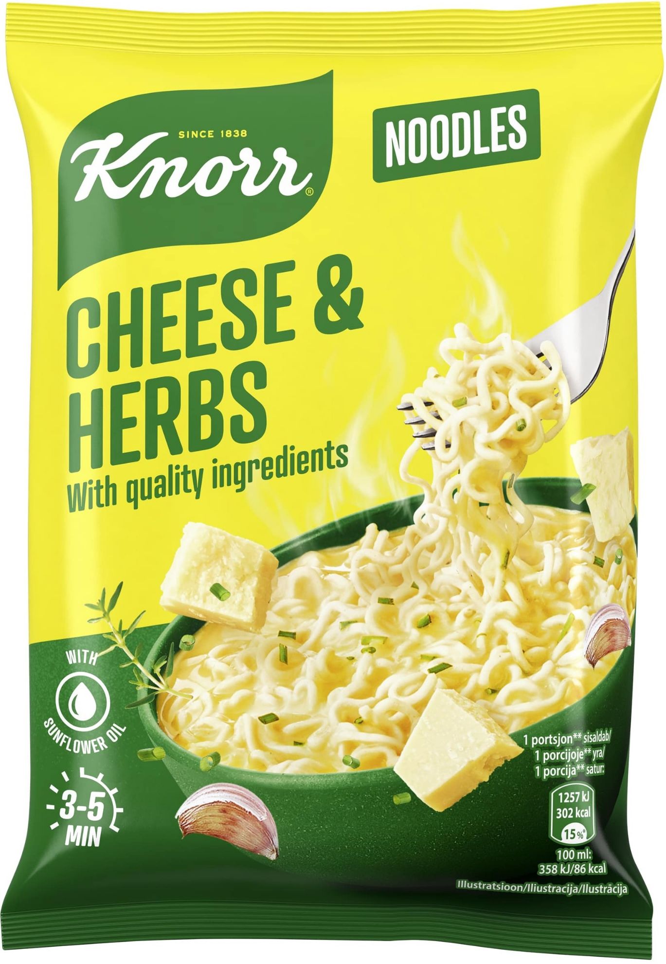 Nūdeles 85%, KVIEŠU milti, palmu tauki, sāls, modificēta ciete, rapšu eļļa, antioksidanti (tokoferola ekstrakts, L-askorbilpal-mitāts). Garšvielu maisiņš 15%: SIERS 22%, palmu tauki, sāls, garšas pastiprinātāji (mono nātrija glutamāts, dinātrija inozonāts, dinātrija guanilāts), cukurs, LAKTOZE, hidrolizētas augu olbaltumvielas, aromatizētāji, biezinātājs (tara sveķi), SŪKALAS (PIENS), sāls aizstājējs, PIENA olbaltumvielas, kurkuma, ķiploks, maurloki, timiāns, skābe (citronskābe)